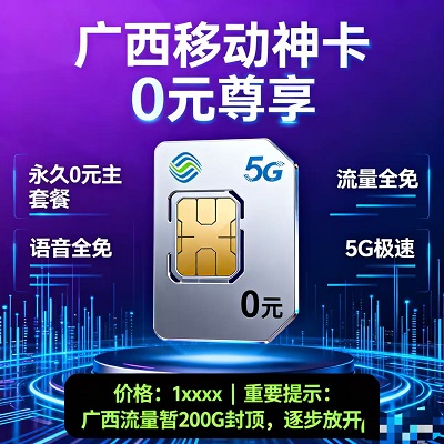 广西移动神卡新到!0元永久主套餐直接拉满福利,语音全免、流量全免、短信全免,5G极速服务0元解锁,追剧、打游戏、办公都顺畅~ 注:广西目前流量200G封顶,后续将逐步放开限制,价格1xxxx,错过拍大腿!