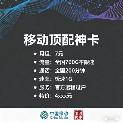 省钱又好用的移动神卡!月租仅7元,全国700G不限速流量畅用,1G极速上网速率加持,上网体验拉满,告别网速焦虑。还有200分钟全国通话,通讯流量一站式满足,官方正规远程过户,流程简单高效,无需线下奔波,特价4xxx就能入手,低月租高配置,性价比绝了!