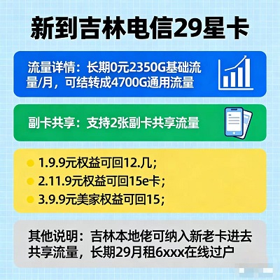 横向对比吉林市面上的所有手机套餐,电信29星卡的性价比真的无人能打!同样29元月租,其他套餐最多给几十G流量,还全是定向;而电信29星卡直接给到2350G基础流量+4700G结转流量,全是通用流量!支持2张副卡+本地新老卡共享,其他套餐要么不支持副卡,要么副卡要额外收费;更别说权益返利——花9.9元返利12+,花11.9元返利15元,其他套餐要么没权益,要么权益全是“套路”!长期月租不涨价+在线过户保障,综合下来,吉林电信29星卡不管是流量、共享、权益还是稳定性,都是同价位的天花板,吉林人办卡只选性价比,这张卡闭眼入不踩雷!