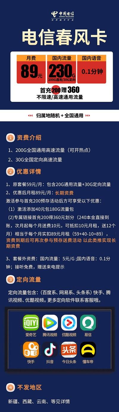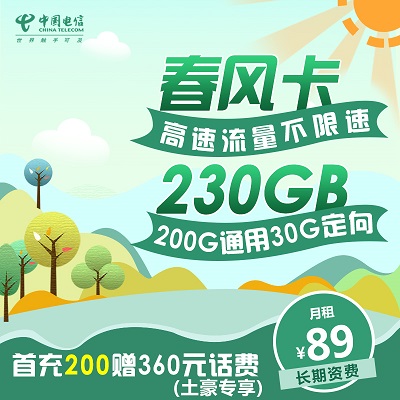 电信春风卡 89元200G通用+30G定向