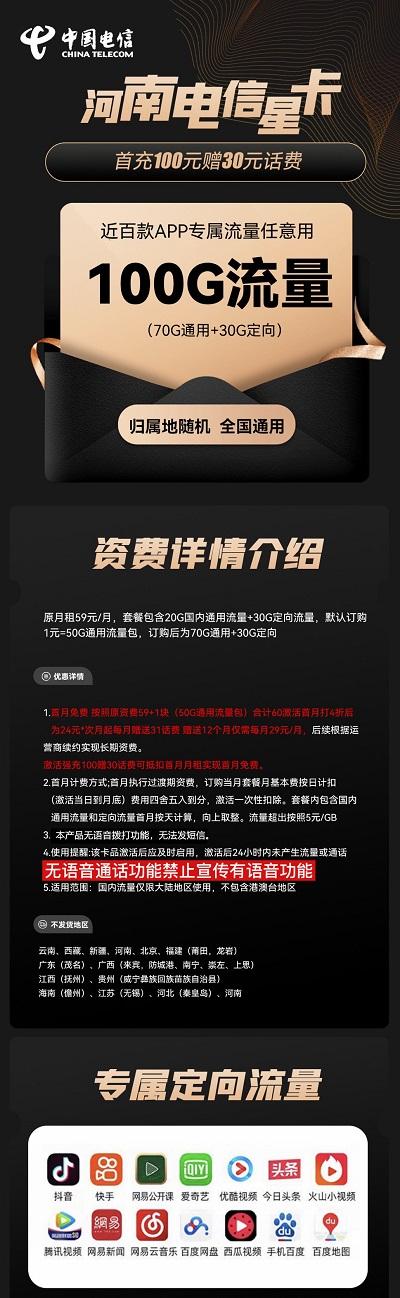 河南电信星卡29元70G通用+30G定向
