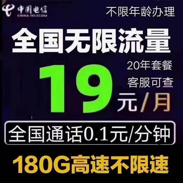 电信山东爽卡流量:全国通用180G不限速,超180g降速1M, 无二次限速