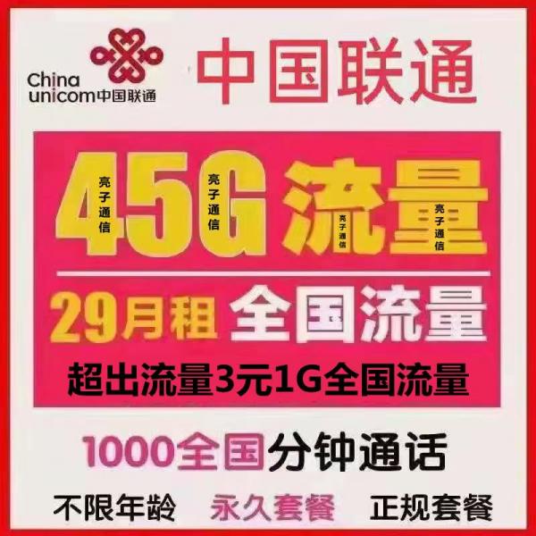 联通政企优惠套餐29元包1000全国分钟45G超大流量 超出3元1G