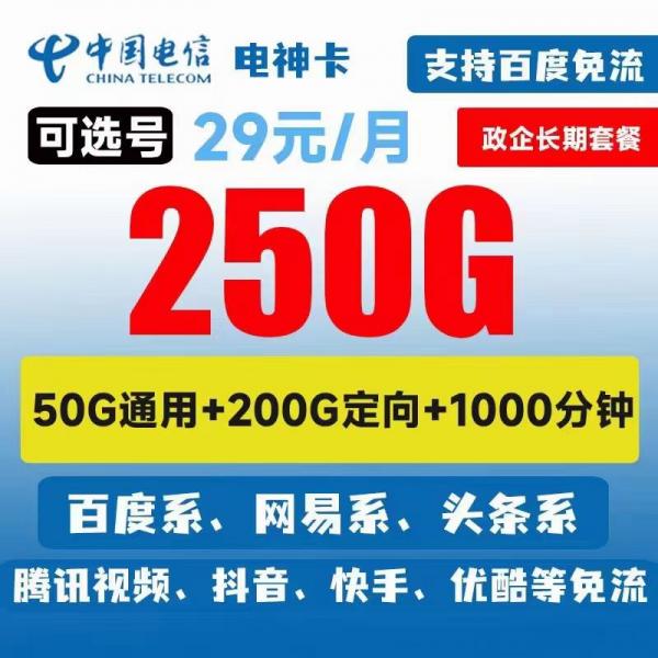电信双完美 大流量大分钟 月租29元250g全国流量1000分钟通话