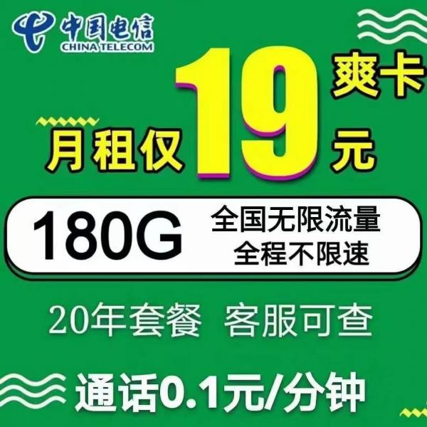 19爽,月租19元包无限量,180g后限速,永久套餐,邮寄原件过户!
