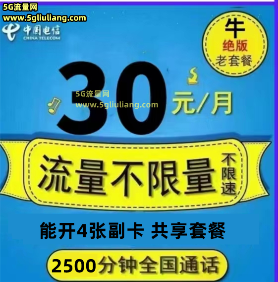 电信牛卡30元月租 不限量不限速2500全国分钟 能开宽带 能开副卡