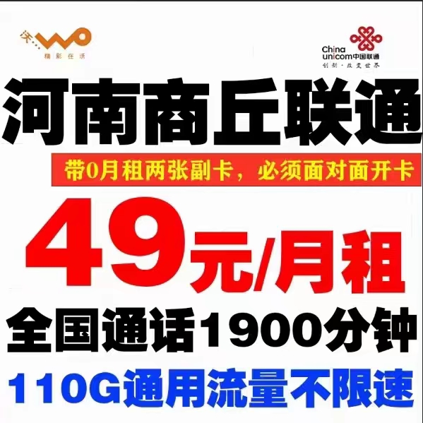 河南联通49包1900分钟110G300兆宽带2个副卡