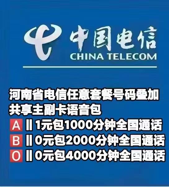 河南省电信任意套餐号码叠加共享主副卡语音包
