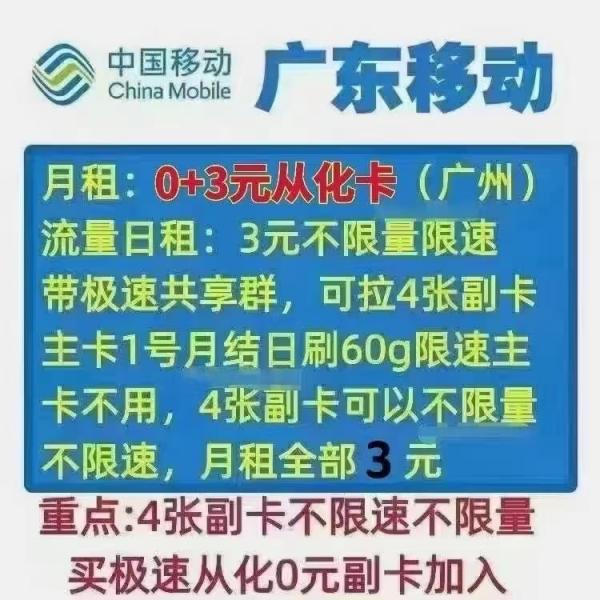 广州移动不限量不限速0+3一条龙(极速副卡➕ 卡位买断1xxx)