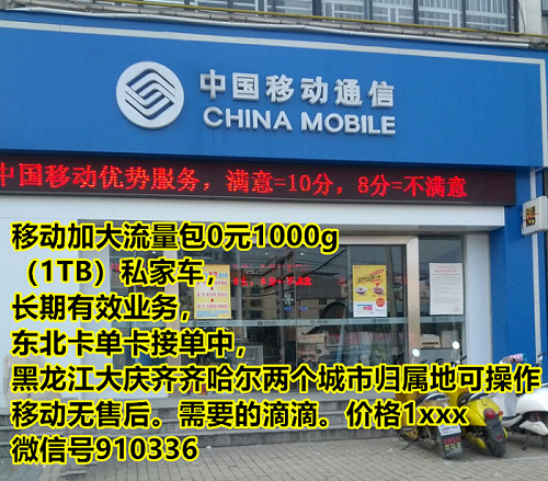 移动加大流量包0元1000g(1TB)私家车,长期有效业务,东北卡单卡接单中,黑龙江大庆齐齐哈尔两个城市归属地可操作移动无售后。需要的滴滴。价格1xxx微信号910336
