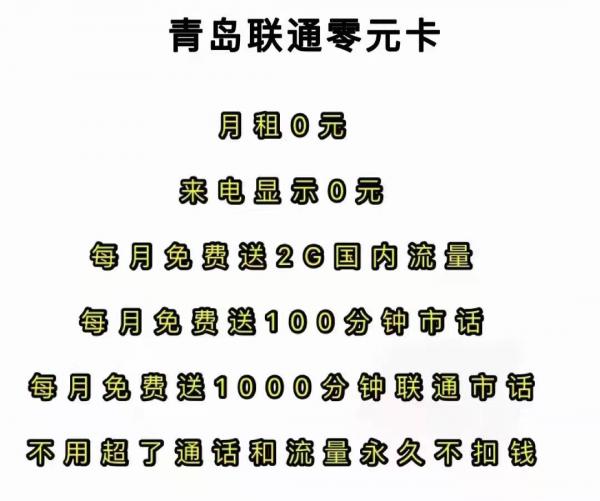 【青岛联通绝版0元卡】月租:0元包来电显示➕100分钟市话➕1000分钟联通市话➕2g国内流量