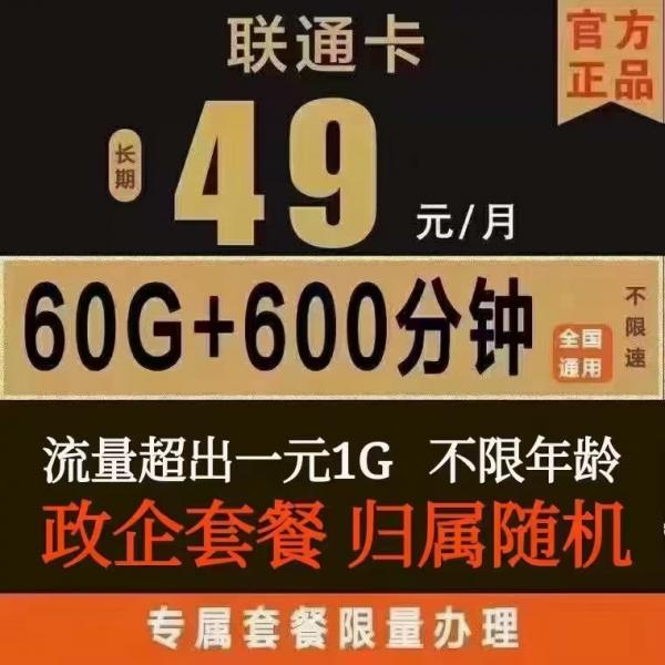 广东联通49先锋卡 正规政企套餐 每月𝟰𝟵元(永久)𝟲𝟬𝐆全国通用流量