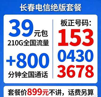 在长春,稀缺的永远是“终身有效、全全国资源、无套路”的绝版通信套餐。这款电信39元套餐,集齐了所有用户梦寐以求的优点:210G纯全国流量、800分钟全国通话、153 0430 3678板正靓号、899元一口价、双重过户无忧、终身无隐形消费。